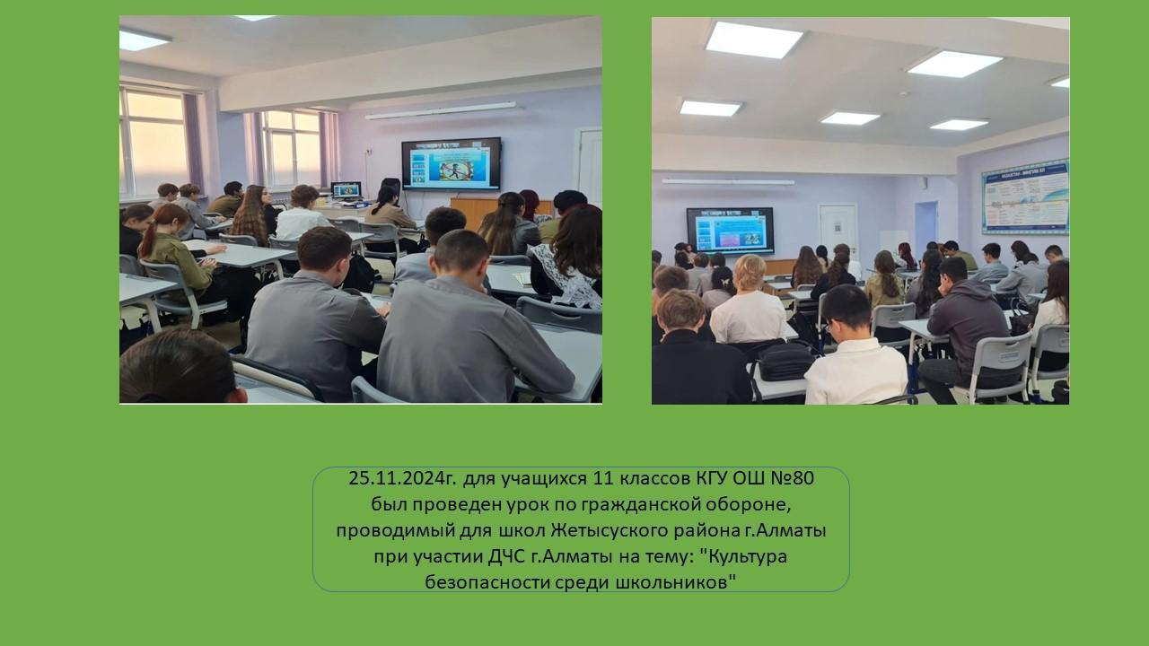 25.11.2024г. для учащихся 11 классов КГУ ОШ №80 был проведен урок по гражданской обороне, проводимый для школ Жетысуского района г.Алматы при участии ДЧС г.Алматы на тему: "Культура безопасности среди школьников"