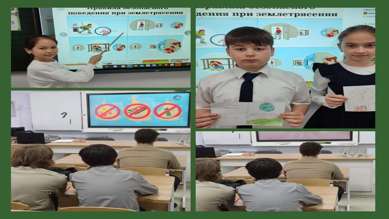 17 наурыз күні жоғарғы сыныптарда «Көмек» бағдарламасы аясында «Жер сілкінісі кезінде әрекет ету тәртібі» тақырыбында сынып сағаттары өткізілді.