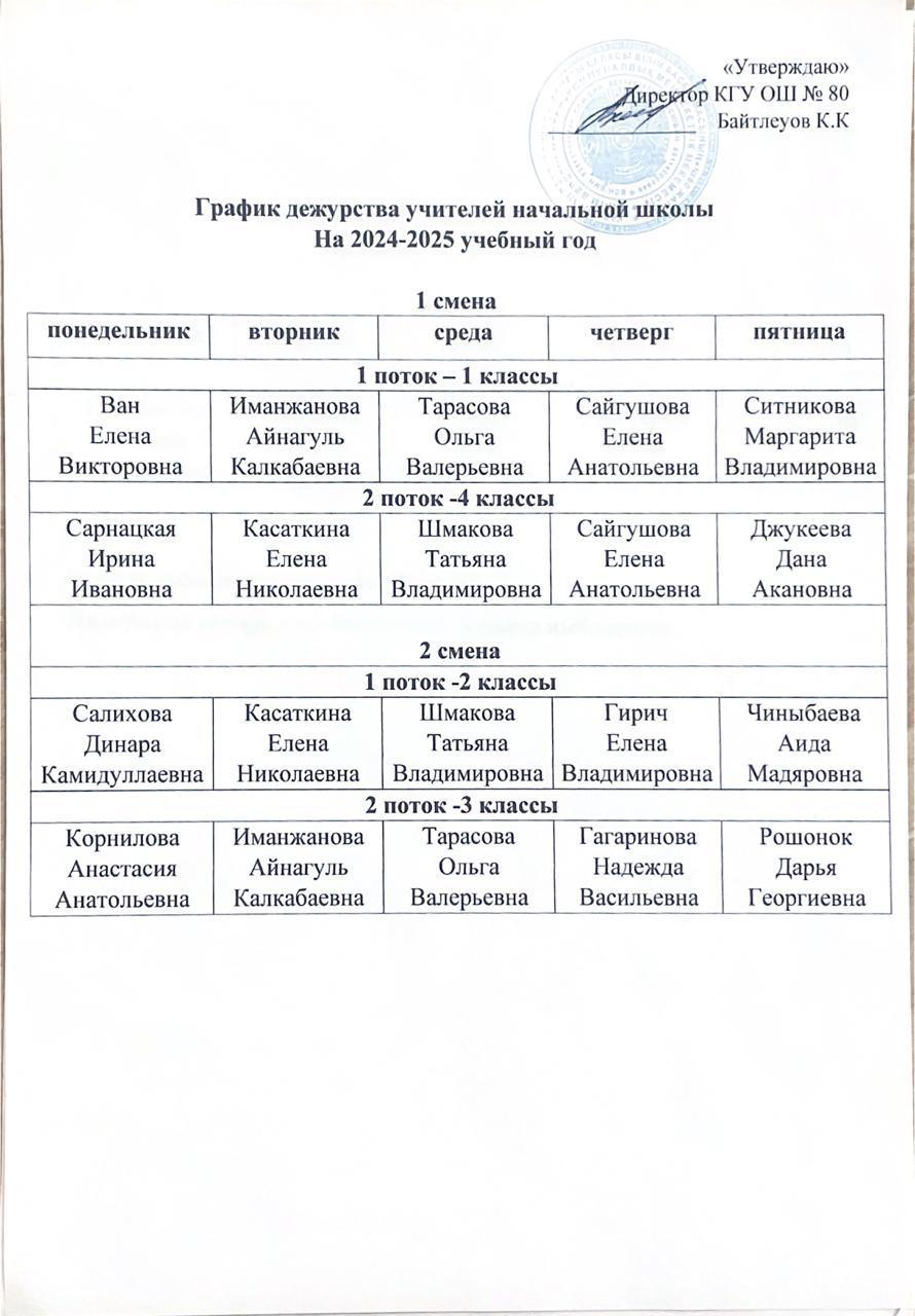 График дежурства учителей начальной школы на 2023-2024 учебный год